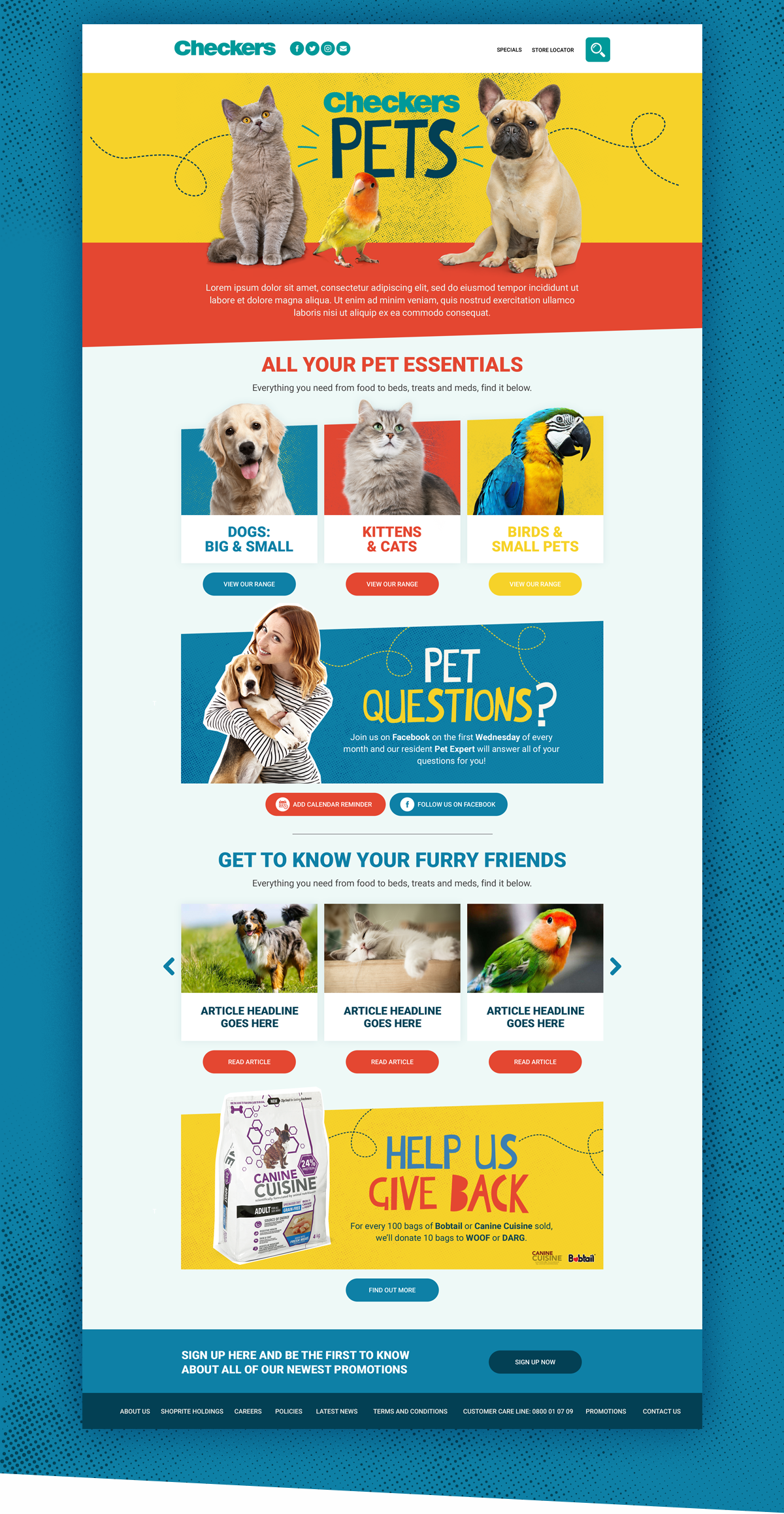 At 99c, Checkers asked us to relook their Pets category. This is a look & feel we developed, along with a website hub, a custom typeface and treatment consideration for social posts.